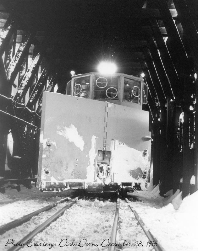 ![]() A spreader set pauses inside the wooden shed at the west end of Tunnel 41, "The Big Hole" December 23, 1996 |