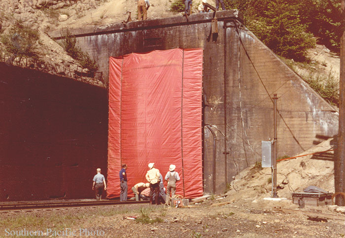 Once approved, Eugene Canvas Products constructed a 16'9" x 24' 18 oz vinyl coated nylon curtain complete with grommets, 1 1/2" rings, and nylon rope. The curtain was driven by an electric motor wired to the track circuits placed 400 ft. from the curtain. When a train passed over the circuits, the curtain would raise and then close after the train's passage. The curtain was felxible so that no damage to a train would result if it was struck. In addition, an emergency push-button was attached to the circuit for manual operation to prevent personnel from becoming trapped in the tunnel.