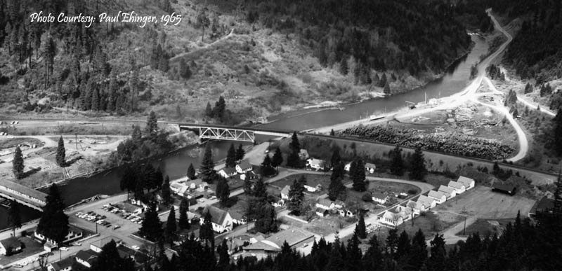 1965 view of the east side of Westfir. The Edward Hines company housing canbe seen in the bottom right of the photo, as well as the log dump area |