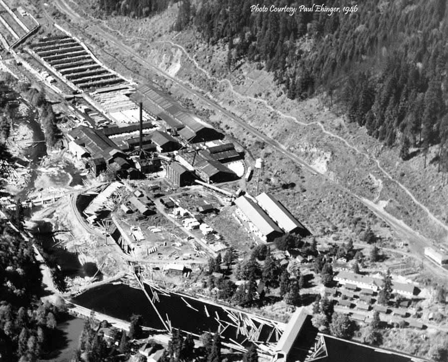1946 view of the mill. The Southern Pacific Railroad trainorder office can be seen in the right of the photo. This photo was taken while flying over the south end of Westfir |