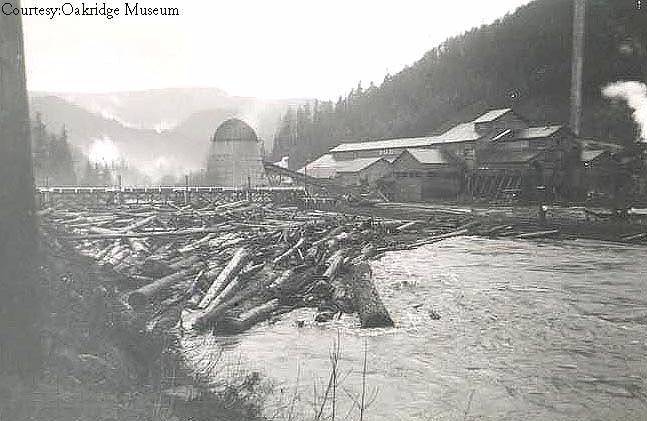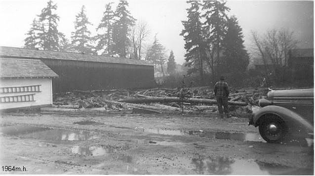 Flooding managed to wipe out the dam used to back up water for the mill pond. On one occasion, the covered bridge, about a quartermile upstream, broke loose and floated downstream! The next three photos were taken in sequence as the covered bridge floated downstream.