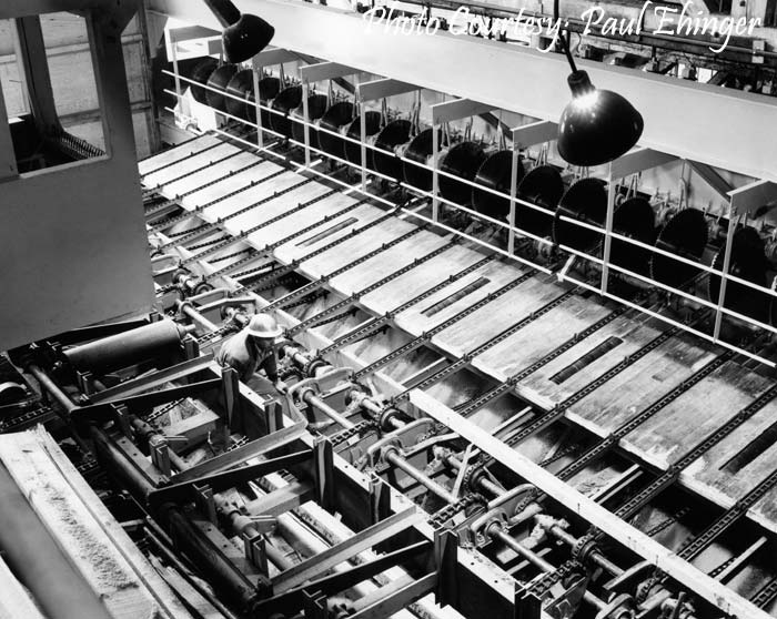 Transfer deck leading under the mill floor to the grading chain |