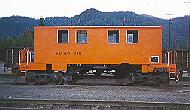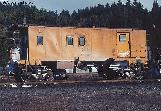 When snowfall is light, the flanger is put to work. The flangers have two steel blades that are lowered between the rails. One blade throws snow to one side of the track, while the other blade does just the opposite. The springs have been removed from the trucks to prevent the spreader from moving up and down while the blades are lowered. If the flanger did have the springs, the blades could drop deep enough to damage the track structure or derail the flanger. The SP flangers are not bi-directinal, so they need to be turned either on a wye or turntable.