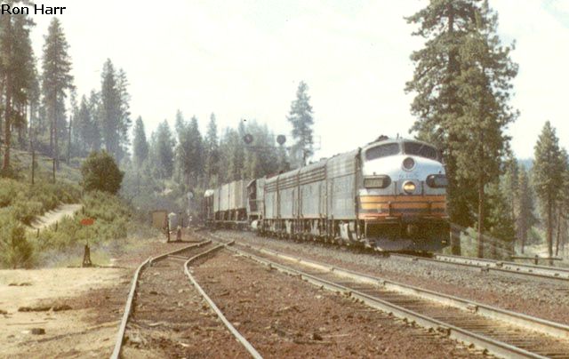 Black Widow painted F units pull an eastbound upgrade over the west switch of Calimus.