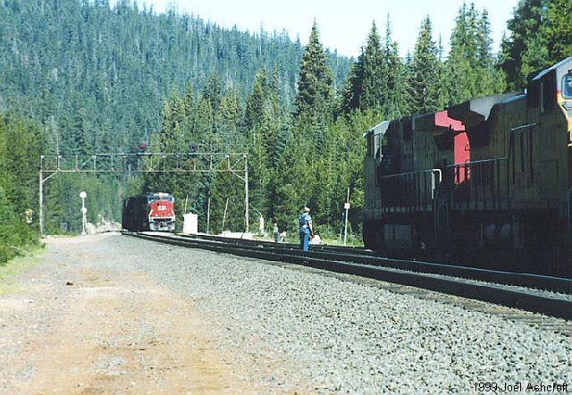 SP C44-9W #8114 waits in the hole for a helper to take it down the mountain. The train did not have enough dynamic brake to safely descend the mountain