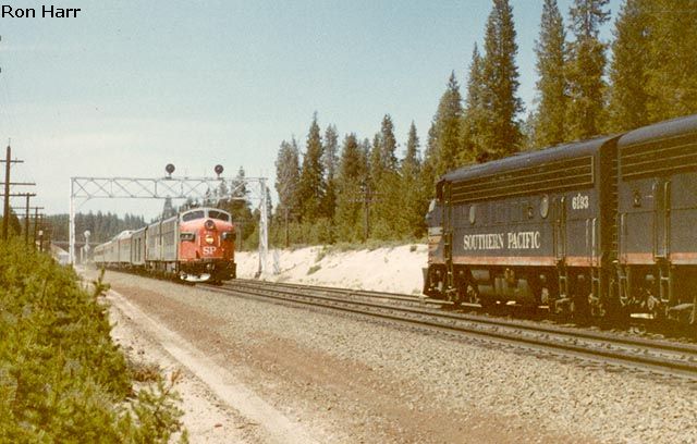 An eastbound holds the siding at Chemult while Bloody Nose painted F units lead a passenger