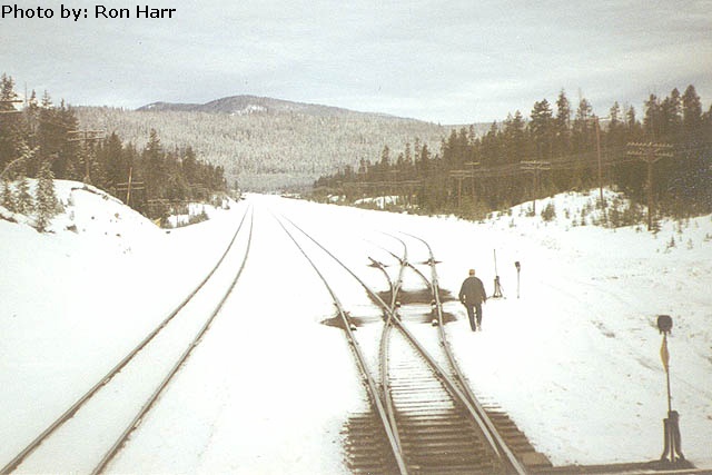 Two westbounds wait in the yard for an eastbound to make a crew change and depart for the hill. |