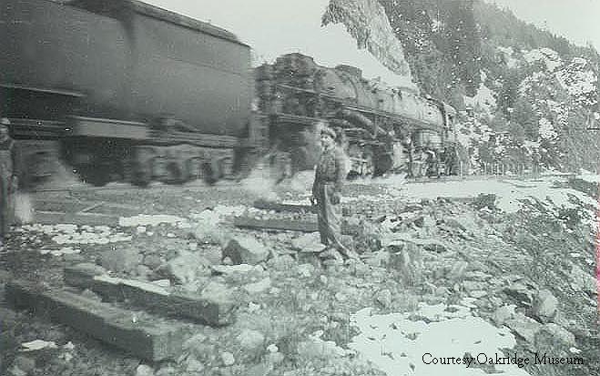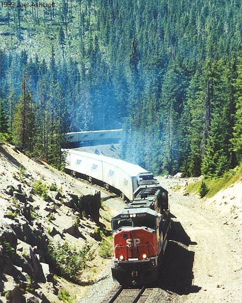 SP SD-70M leads the westbound Swift RoadRailer train through an S curve above the Diamond Creek Fill just west of Tunnel #4. |
