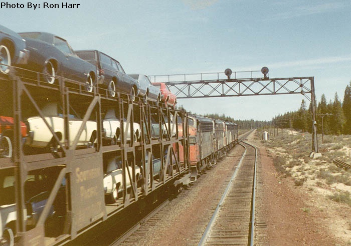 A loaded autorack train rolls at track speed over the east switch of Diamond Lake