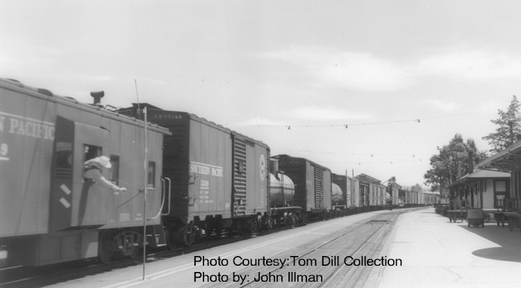 Conductor on 2nd section of train 673 grabs the orders while passing the Eugene Depot |