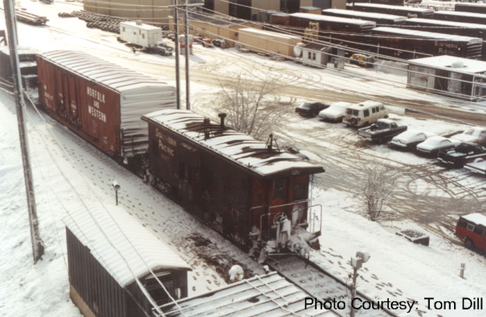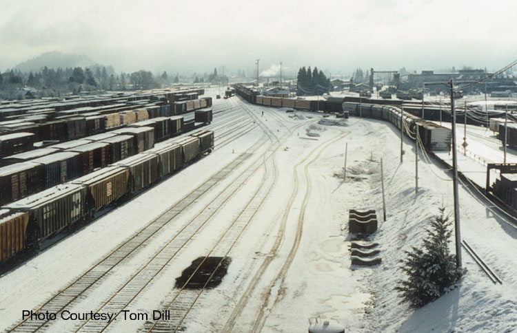 Looking south from the crest tower as an inbound train is being shoved on the 70 lead up the hump