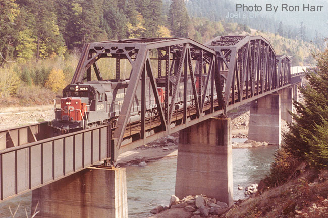 SD-45T-2 #9258 leads an eastbound pig across the Willamette River Bridge at Milepost 590, just west of Hampton.