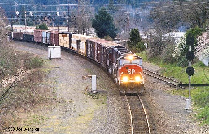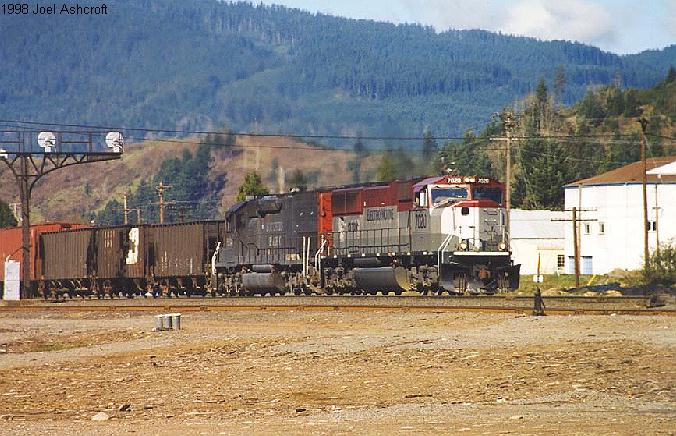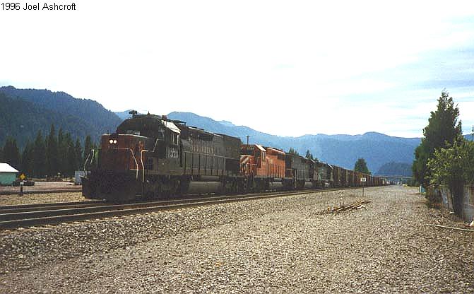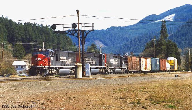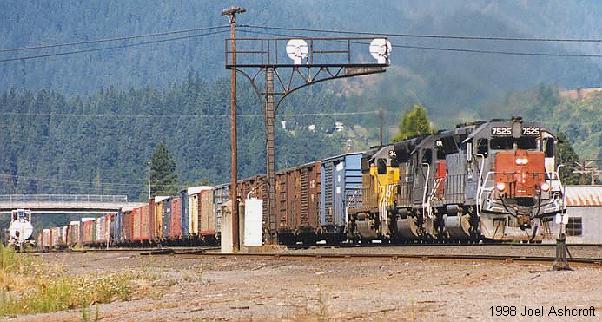 SD-45 #7525 leads a westbound through Oakridge during the summer of 1998 |