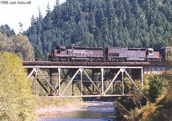 SP SD-40M-2 #8590 and an SD-40T-2 shove a westbound through Westfir. I took the photo from the covered bridge.