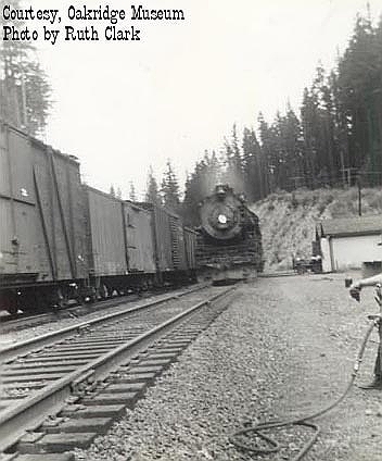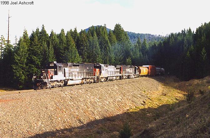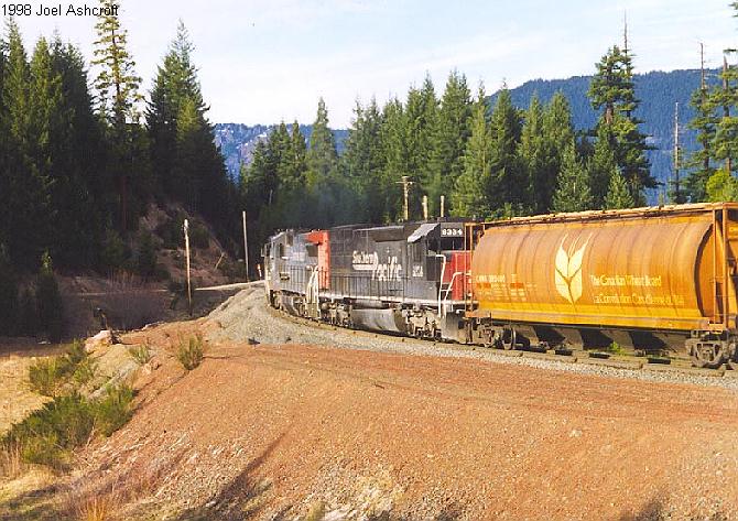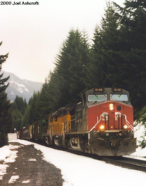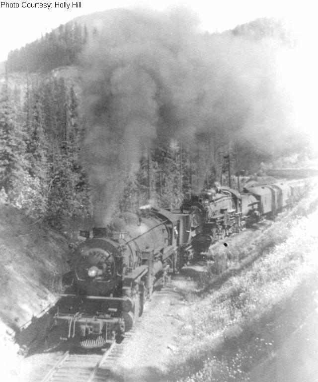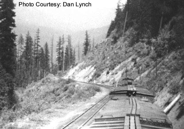 Westbound freight at the slide below Feilds. The train is emerging from Tunnel #17 |