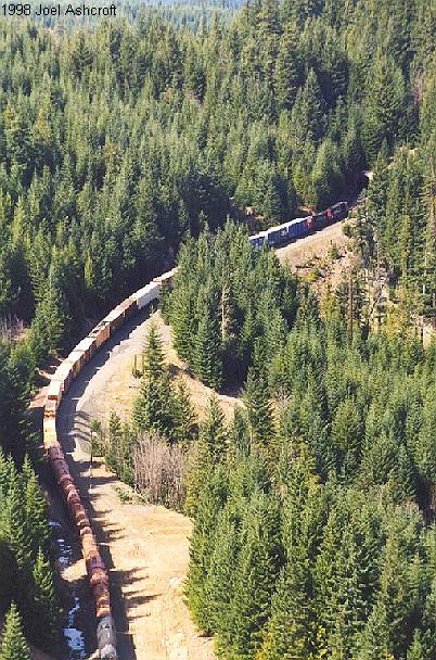 This view, taken from Tunnel #15 above Fields, shows a westbound freight on the middle level of the loops approaching Tunnel #18 |